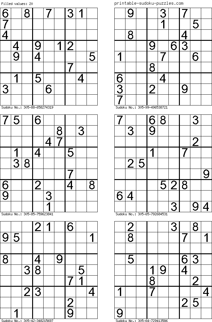 Source: printablesudokufree.com Image or pdf, 6 sudokus per page. There are 4 sudoku puzzles per page.